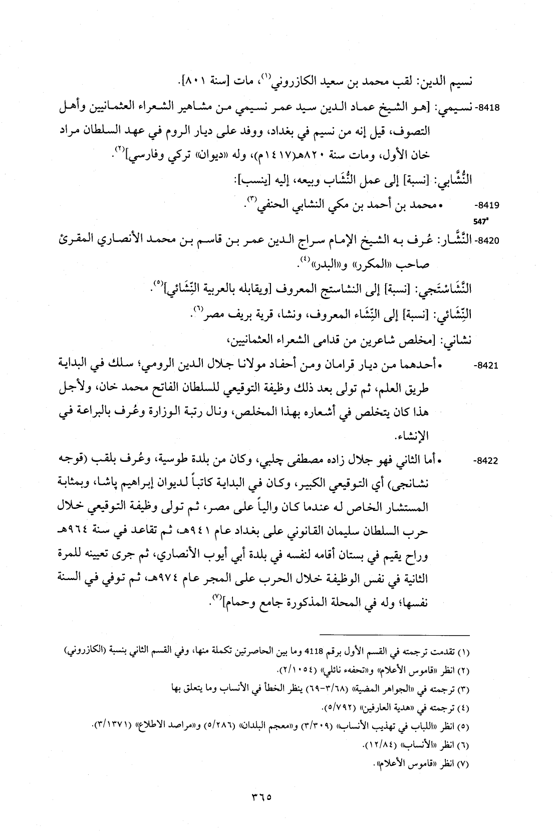 8418 - نسيمي: [هو الشيخ عماد الدين سيد عمر نسيمي من مشاهير الشعراء العثمانيين وأهل التصوف، قيل إنه من نسيم في بغداد، ووفد على ديار الروم في عهد السلطان مراد خان الأول، ومات سنة 820 هـ (1417 م)، وله "ديوان" تركي وفارسي] (¬2).