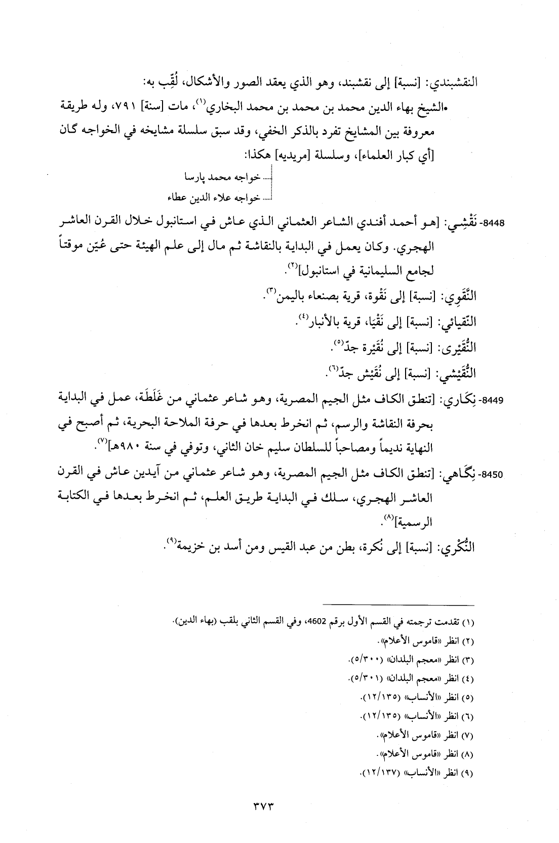 8448 - نَقْشِي: [هو أحمد أفندي الشاعر العثماني الذي عاش في إستانبول خلال القرن العاشر الهجري. وكان يعمل في البداية بالنقاشة ثم مال إلى علم الهيئة حتى عُيّن موقتاً لجامع السليمانية في إستانبول] (¬2).