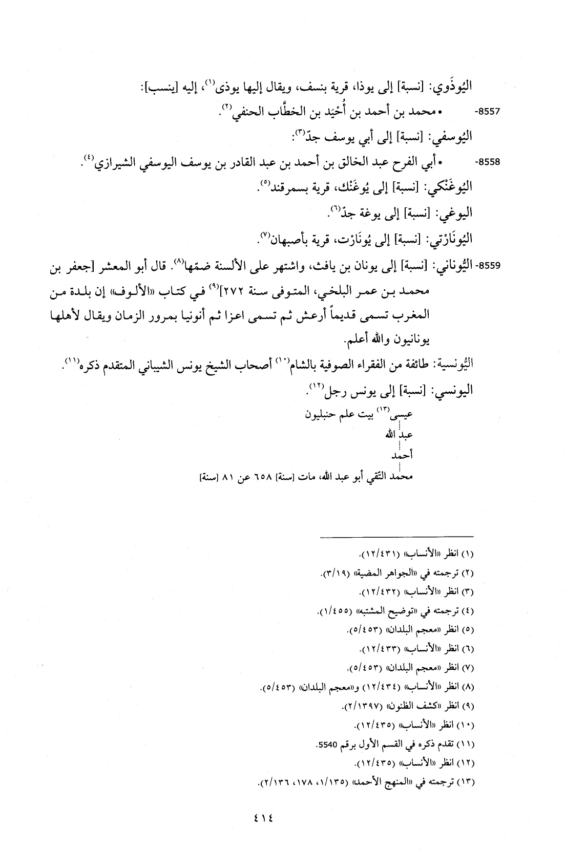 8559 - اليُّوناني: [نسبة] إلى يونان بن يافث، واشتهر على الألسنة ضمّها (¬8). قال أبو المعشر [جعفر بن محمد بن عمر البلخي، المتوفى سنة 272] (¬9) في كتاب "الألوف" إن بلدة من المغرب تسمى قديماً أرعش ثم تسمى اعزا ثم أنونيا بمرور الزمان ويقال لأهلها يونانيون والله أعلم.