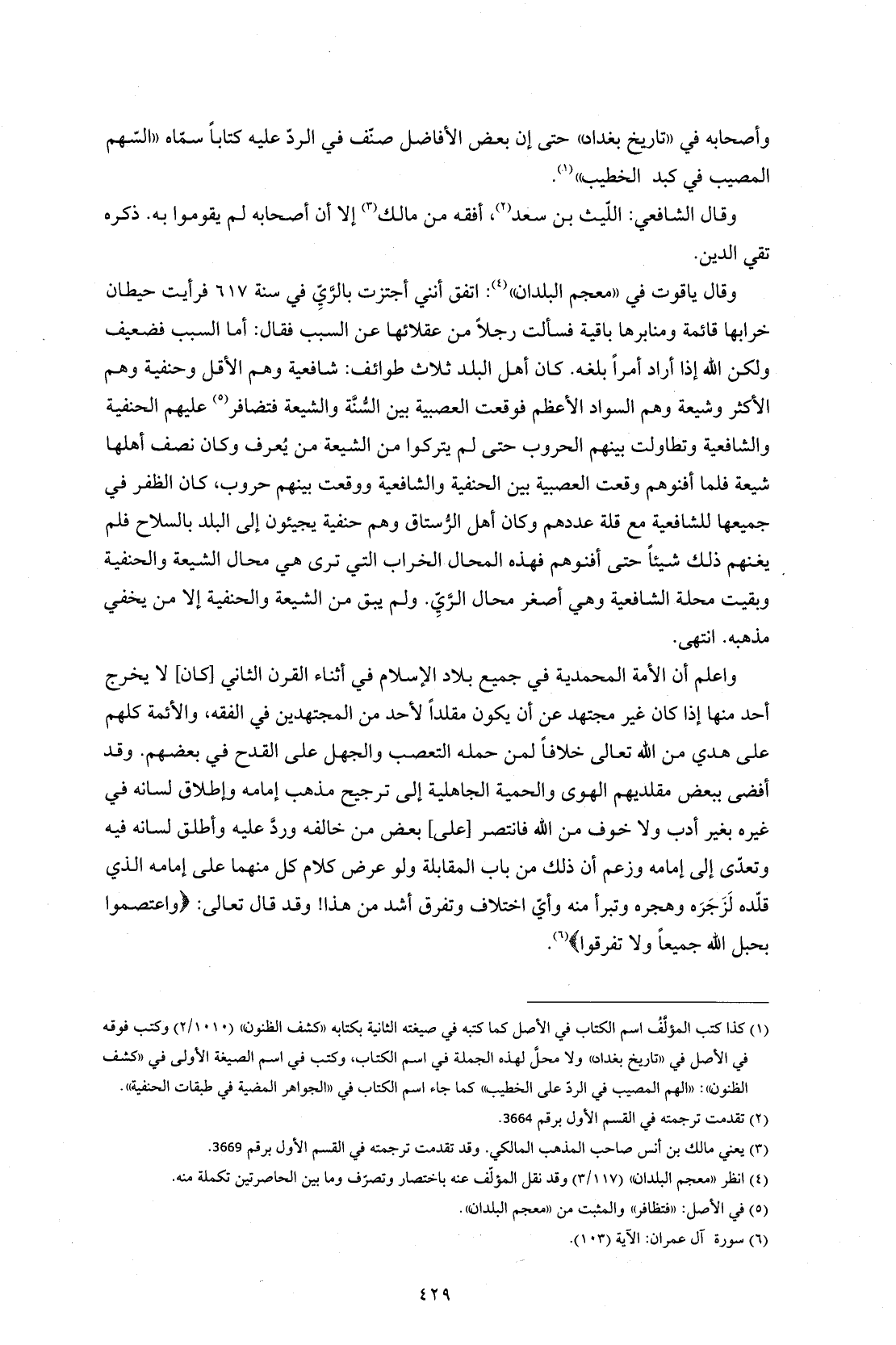(¬1) كذا كتب المؤلفُ اسم الكتاب في الأصل كما كتبه في صيغته الثانية بكتابه "كشف الظنون" (2/ 1010) وكتب فوقه في الأصل في "تاريخ بغداد"ولا محلَّ لهذه الجملة في اسم الكتاب، وكتب في اسم الصيغة الأولى في "كشف الظنون": "الهم المصيب في الردّ على الخطيب" كما جاء اسم الكتاب في "الجواهر المضية في طبقات الحنفية ".