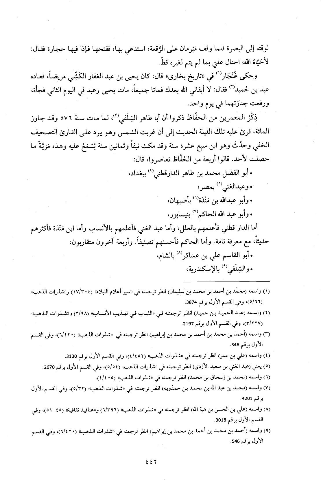 أما الدارقطني فأعلمهم بالعلل، وأما عبد الغني فأعلمهم بالأنساب وأما ابن مَنْدَة فأكثرهم حديثاً، مع معرفة تامة. وأما الحاكم فأحسنهم تصنيفاً. وأربعة آخرون متقاربون: