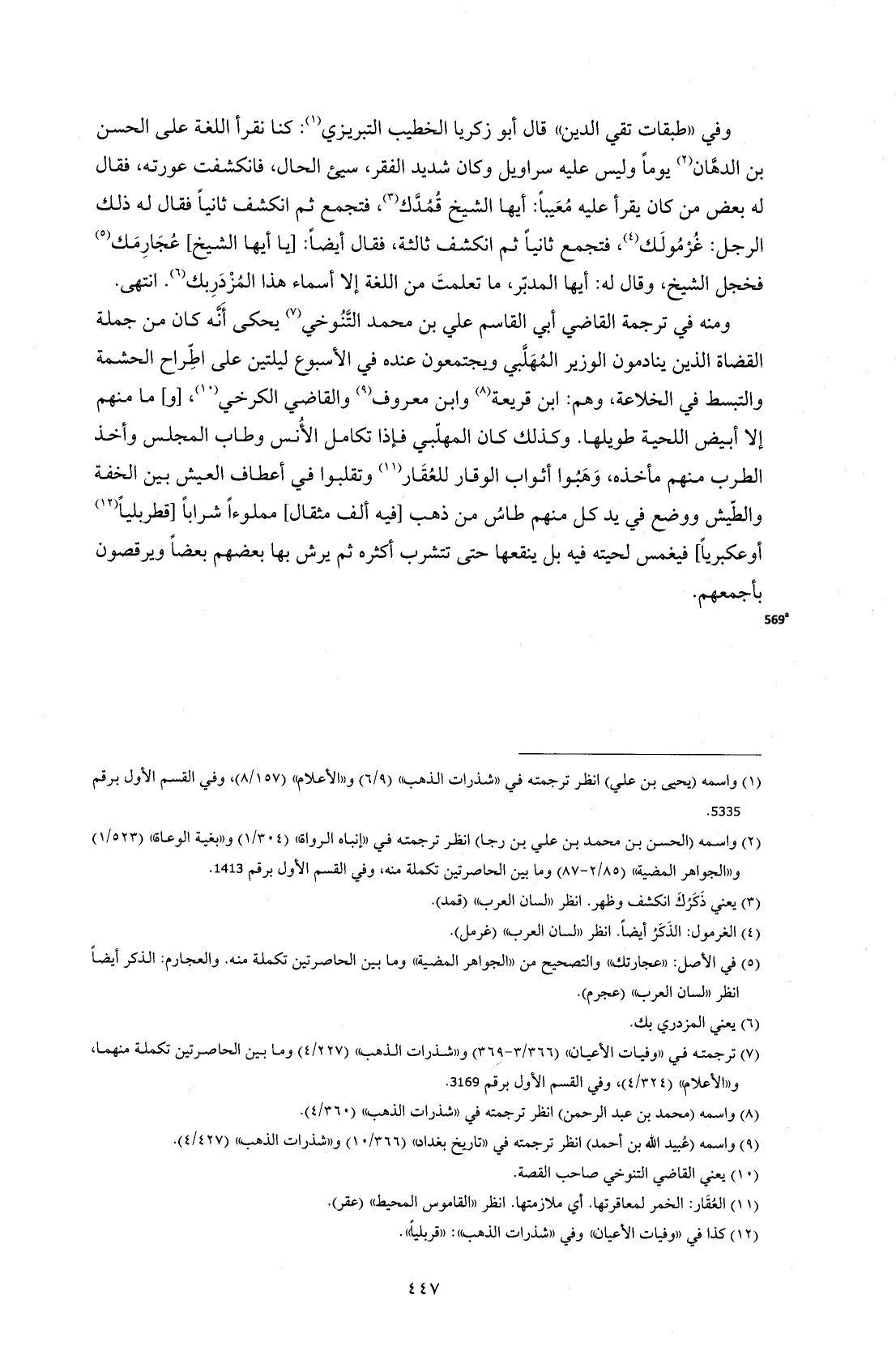 ومنه في ترجمة القاضي أبي القاسم علي بن محمد التَّنُوخي (¬7) يحكى أَنَّه كان من جملة القضاة الذين ينادمون الوزير المُهَلّبي ويجتمعون عنده في الأسبوع ليلتين على اطِّراح الحشمة والتبسط في الخلاعة، وهم: ابن قريعة (¬8) وابن معروف (¬9) والقاضي الكرخي (¬10)، [و] ما منهم إلا أبيض اللحية طويلها. وكذلك كان المهلّبي فإذا تكامل الأُنس وطاب المجلس وأخذ الطرب منهم مأخذه، وَهَبُوا أثواب الوقار للعُقَار (¬11) وتقلبوا في أعطاف العيش بين الخفة والطّيش ووضع في يد كل منهم طاسُ من ذهب [فيه ألف مثقال] مملوءاً شراباً [قطربلياً (¬12) أوعكبرياً] فيغمس لحيته فيه بل ينقعها حتى تتشرب أكثره ثم يرش بها بعضهم بعضاً ويرقصون بأجمعهم.