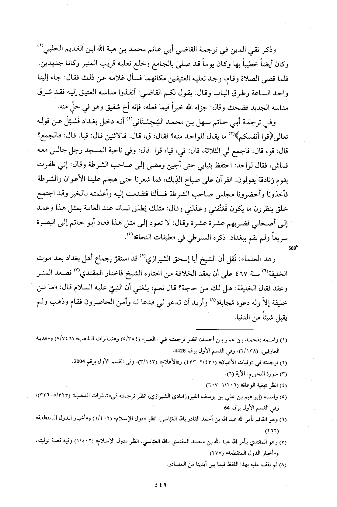 وذكر تقي الدين في ترجمة القاضي أبي غانم محمد بن هبة الله ابن العَديم الحلبي (¬1) وكان أيضاً خطيباً بها وكان يوماً قد صلى بالجامع وخلع نعليه قريب المنبر وكانا جديدين. فلما قضى الصلاة وقام، وجد نعليه العتيقين مكانهما فسأل غلامه عن ذلك فقال: جاء إلينا واحد الساعة وطرق الباب وقال: يقول لكم القاضي: أنفذوا مداسه العتيق إليه فقد سُرق مداسه الجديد فضحك وقال: جزاه الله خيراً فيما فعله، فإنه أخ شفيق وهو في حِلٍّ منه.