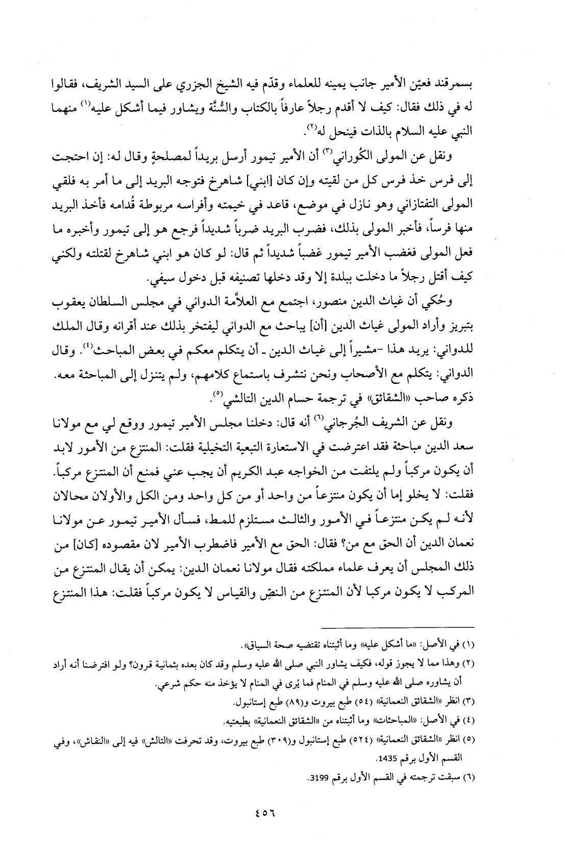 ونقل عن الشريف الجُرجاني (¬6) أنه قال: دخلنا مجلس الأمير تيمور ووقع لي مع مولانا سعد الدين مباحثة فقد اعترضت في الاستعارة التبعية التخيلية فقلت: المنتزع من الأمور لابد أن يكون مركباً ولم يلتفت من الخواجه عبد الكريم أن يجب عني فمنع أن المنتزع مركباً. فقلت: لا يخلو إما أن يكون منتزعاً من واحد أو من كل واحد ومن الكل والأولان محالان لأنه لم يكن منتزعاً في الأمور والثالث مستلزم للمط، فسأل الأمير تيمور عن مولانا نعمان الدين أن الحق مع من؟ فقال: الحق مع الأمير فاضطرب الأمير لان مقصوده [كان] من ذلك المجلس أن يعرف علماء مملكته فقال مولانا نعمان الدين: يمكن أن يقال المنتزع من المركب لا يكون مركبا لأن المنتزع من النصِّ والقياس لا يكون مركباً فقلت: هذا المنتزع