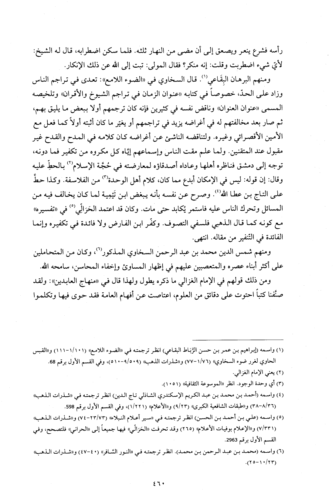 ومنهم البرهان البِقَاعي (¬1). قال السخاوي في "الضوء اللامع": تعدى في تراجم الناس وزاد على الحدّ، خصوصًا في كتابه "عنوان الزمان في تراجم الشيوخ والأقران" وتلخيصه المسمى "عنوان العنوان" وناقض نفسه في كثيرين فإنه كان ترجمهم أولا ببعض ما يليق بهم، ثم صار بعد مخالفتهم له في أغراضه يزيد في تراجمهم أو يغيّر ما كان أثبته أولا كما فعل مع الأمين الأقصرائي وغيره. ولتناقضه الناشئ عن أغراضه كان كلامه في المدح والقدح غير مقبول عند المتقنين. ولما علم مقت الناس وإسماعهم إيَّاه كل مكروه من تكفير فما دونه، توجه إلى دمشق فناظره أهلها وعاداه أصدقاؤه لمعارضته في حُجَّة الإسلام (¬2) بالحطِّ عليه وقال: إن قوله: ليس في الإمكان أبدع مما كان، كلام أهل الوحدة (¬3) من الفلاسفة. وكذا حطَّ على التاج بن عطا الله (¬4). وصرح عن نفسه بأنه يبغض ابن تَيمِية لما كان يخالف فيه من المسائل وتحرك الناس عليه فاستمر يُكابد حتى مات. وكان قد اعتمد الحَرَائِي (¬5) في "تفسيره" مع كونه كما قال الذهبي فلسفي التصوف. وكفر ابن الفارض ولا فائدة في تكفيره وإنما الفائدة في التّنفير من مقاله. انتهى.