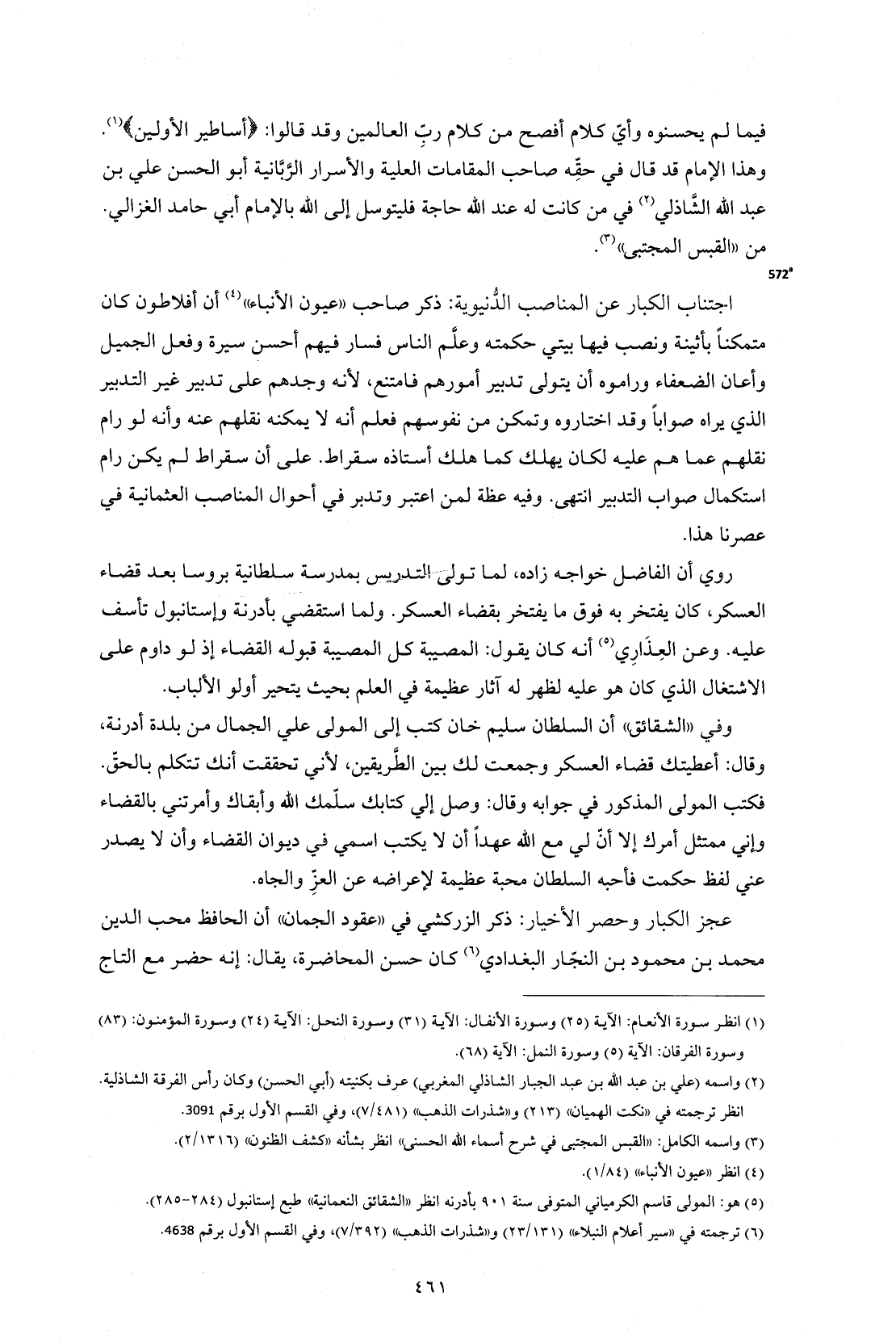 فيما لم يحسنوه وأيّ كلام أفصح من كلام ربِّ العالمين وقد قالوا: {أَسَاطِيرُ الْأَوَّلِينَ} (¬1). وهذا الإمام قد قال في حقِّه صاحب المقامات العلية والأسرار الرَّبَّانية أبو الحسن علي بن عبد الله الشَّاذلي (¬2) في من كانت له عند الله حاجة فليتوسل إلى الله بالإمام أبي حامد الغزالي. من "القبس المجتبى" (¬3).