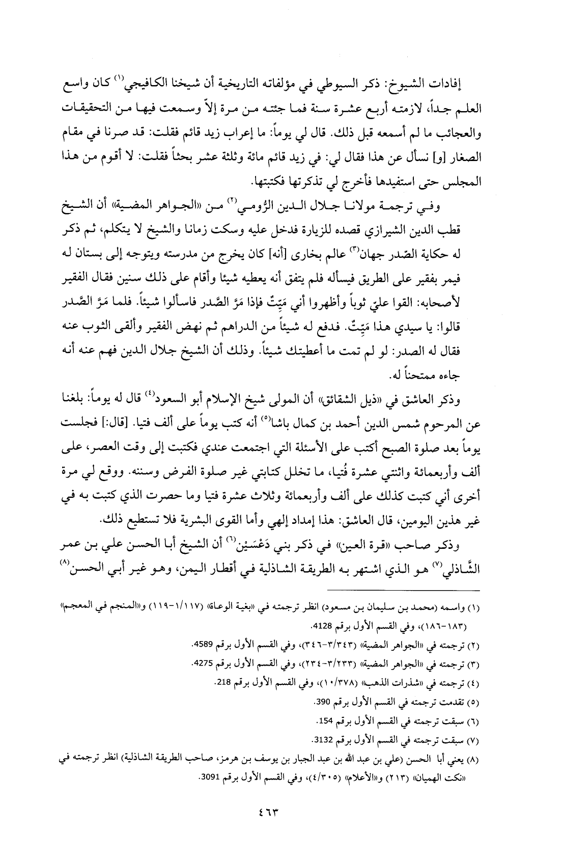 إفادات الشيوخ: ذكر السيوطي في مؤلفاته التاريخية أن شيخنا الكافيجي (¬1) كان واسع العلم جدًا، لازمته أربع عشرة سنة فما جئته من مرة إلاّ وسمعت فيها من التحقيقات والعجائب ما لم أسمعه قبل ذلك. قال لي يومًا: ما إعراب زيد قائم فقلت: قد صرنا في مقام الصغار [و] نسأل عن هذا فقال لي: في زيد قائم مائة وثلثة عشر بحثًا فقلت: لا أقوم من هذا المجلس حتى استفيدها فأخرج لي تذكرتها فكتبتها.