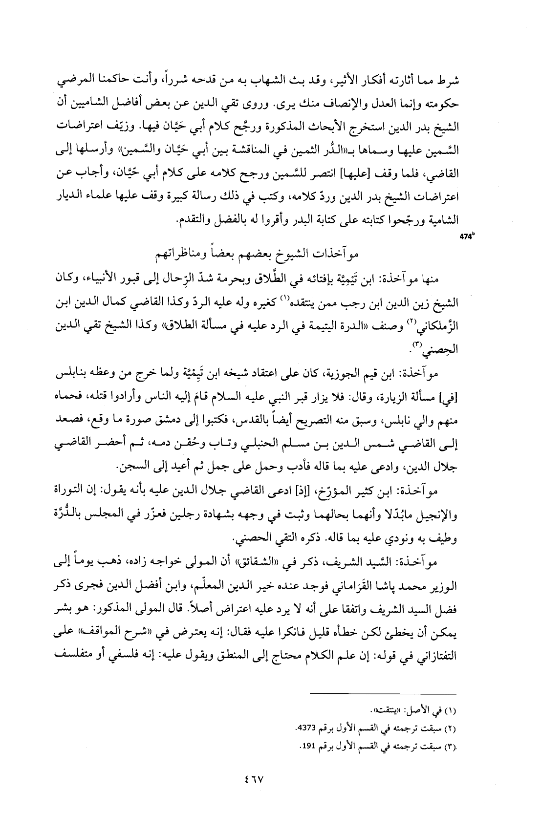 موآخذة: ابن قيم الجوزية، كان على اعتقاد شيخه ابن تَيِمْيَّة ولما خرج من وعظه بنابلس [في] مسألة الزيارة، وقال: فلا يزار قبر النبي -عليه السلام- قامَ إليه الناس وأرادوا قتله، فحماه منهم والي نابلس، وسبق منه التصريح أيضًا بالقدس، فكتبوا إلى دمشق صورة ما وقع، فصعد إلى القاضي شمس الدين بن مسلم الحنبلي وتاب وحُقن دمه، ثم أحضر القاضي جلال الدين، وادعى عليه بما قاله فأدب وحمل على جمل ثم أعيد إلى السجن.