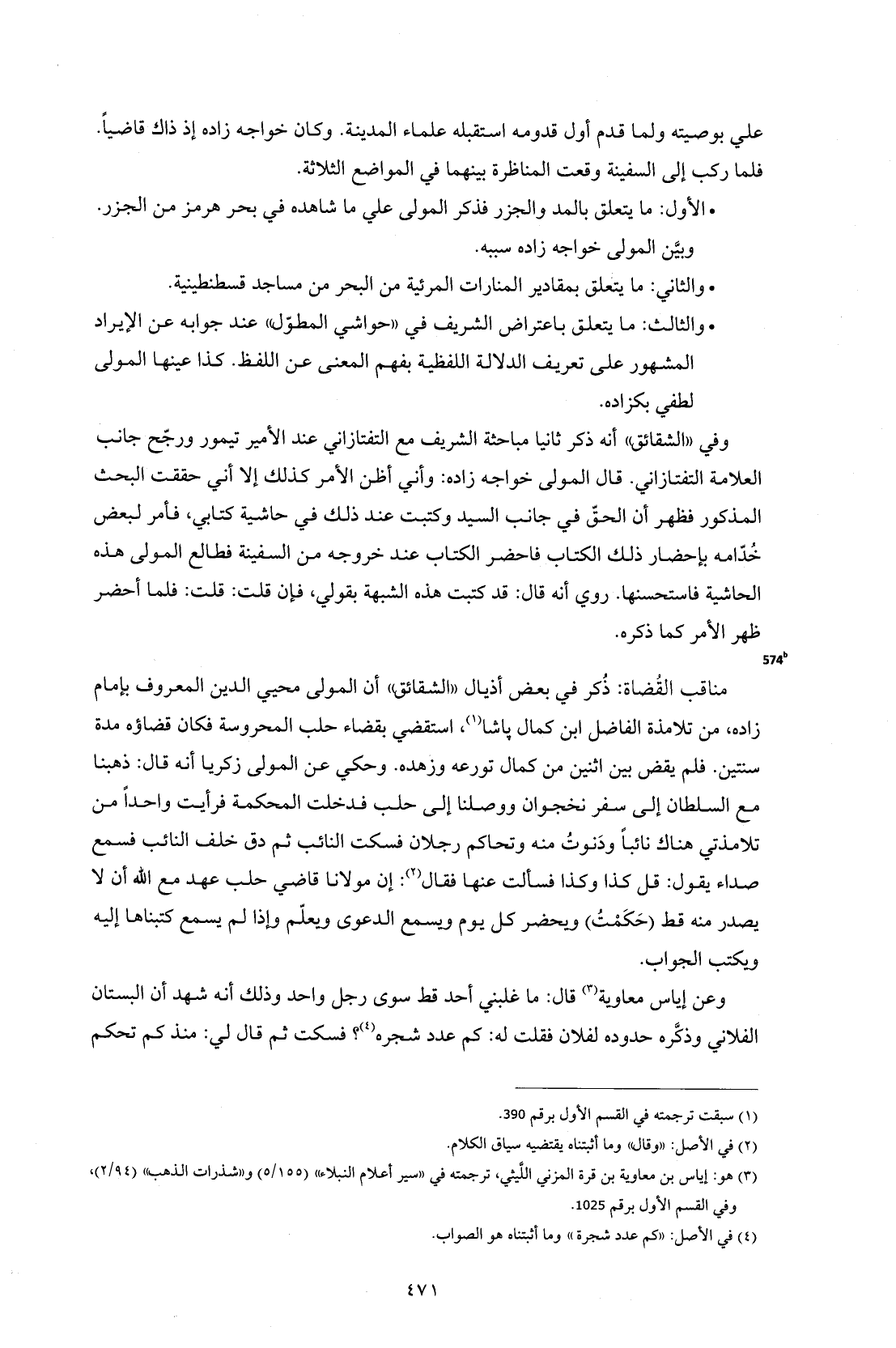 وفي "الشقائق" أنه ذكر ثانيًا مباحثة الشريف مع التفتازاني عند الأمير تيمور ورجّح جانب العلامة التفتازاني. قال المولى خواجه زاده: وأني أظن الأمر كذلك إلا أني حققت البحث المذكور فظهر أن الحقّ في جانب السيد وكتبت عند ذلك في حاشية كتابي، فأمر لبعض خُدّامه بهاحضار ذلك الكتاب فأحضر الكتاب عند خروجه من السفينة فطالع المولى هذه الحاشية فاستحسنها. روي أنه قال: قد كتبت هذه الشبهة بقولي، فإن قلت: قلت: فلما أحضر ظهر الأمر كما ذكره.