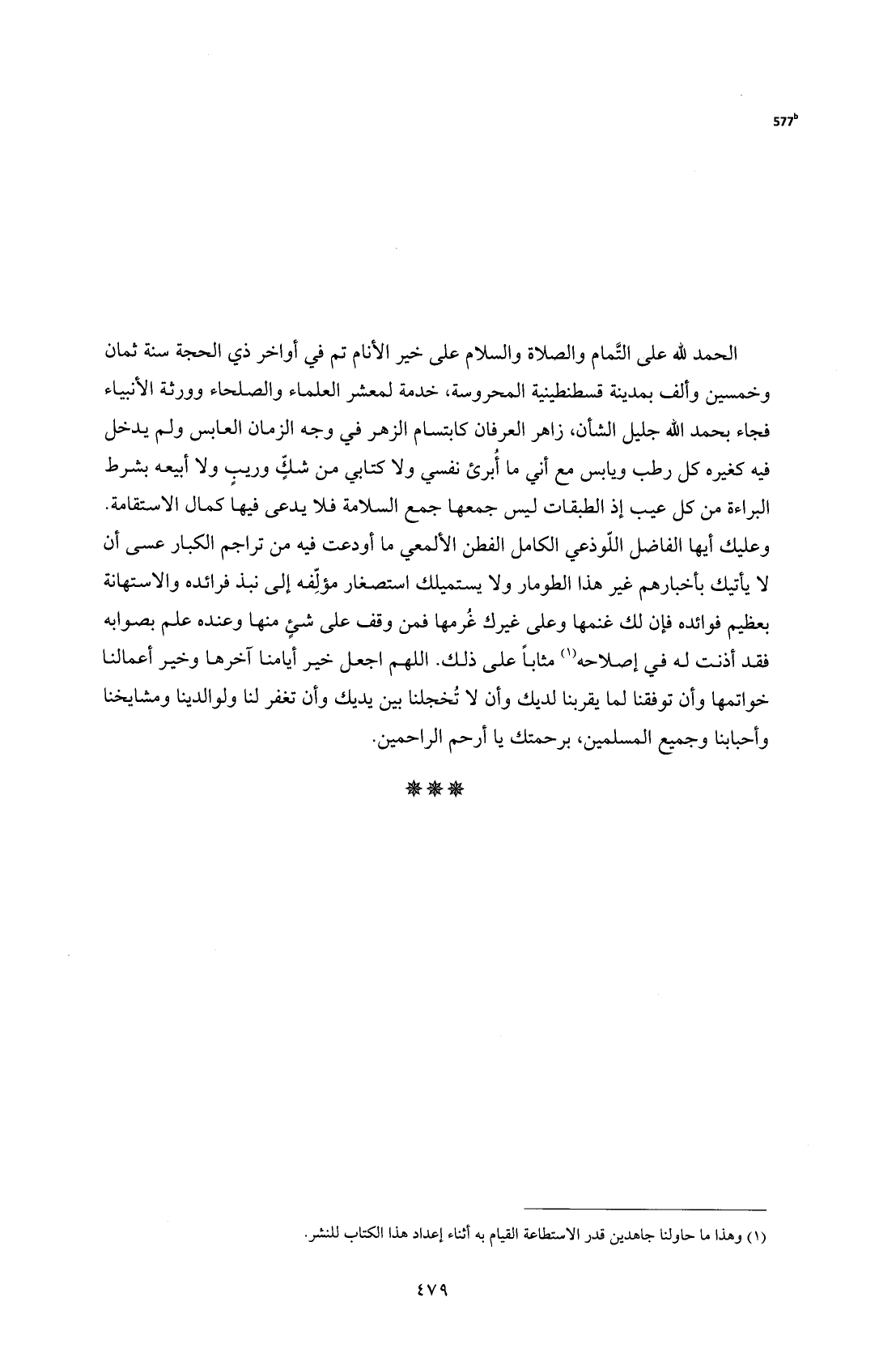 الحمد لله على التَّمام والصلاة والسلام على خير الأنام تم في أواخر ذي الحجة سنة ثمان وخمسين وألف بمدينة قسطنطينية المحروسة، خدمة لمعشر العلماء والصلحاء وورثة الأنبياء فجاء بحمد الله جليل الشأن، زاهر العرفان كابتسام الزهر في وجه الزمان العابس ولم يدخل فيه كغيره كل رطب ويابس مع أني ما أُبرئ نفسي ولا كتابي من شكٍّ وريبٍ ولا أبيعه بشرط البراءة من كل عيب إذ الطبقات ليس جمعها جمع السلامة فلا يدعى فيها كمال الاستقامة. وعليك أيها الفاضل اللّوذعي الكامل الفطن الألمعي ما أودعت فيه من تراجم الكبار عسى أن لا يأتيك بأخبارهم غير هذا الطومار ولا يستميلك استصغار مؤلِّفه إلى نبذ فرائده والاستهانة بعظيم فوائده فإن لك غنمها وعلى غيرك غُرمها فمن وقف على شئٍ منها وعنده علم بصوابه فقد أذنت له في إصلاحه (¬1) مثابًا على ذلك. اللهمَّ اجعل خير أيامنا آخرها وخير أعمالنا خواتمها وأن توفقنا لما يقربنا لديك وأن لا تُخجلنا بين يديك وأن تغفر لنا ولوالدينا ومشايخنا وأحبابنا وجميع المسلمين، برحمتك يا أرحم الراحمين.