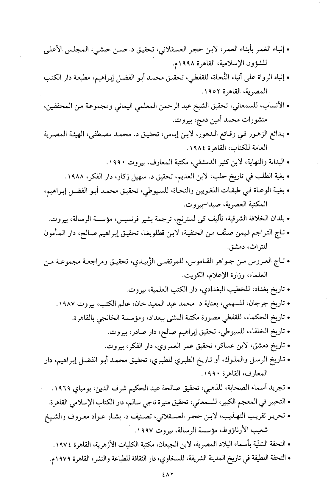 • إنباء الغمر بأبناء العمر، لابن حجر العسقلاني، تحقيق د. حسن حبشي، المجلس الأعلى للشؤون الإِسلامية، القاهرة 1998 م.