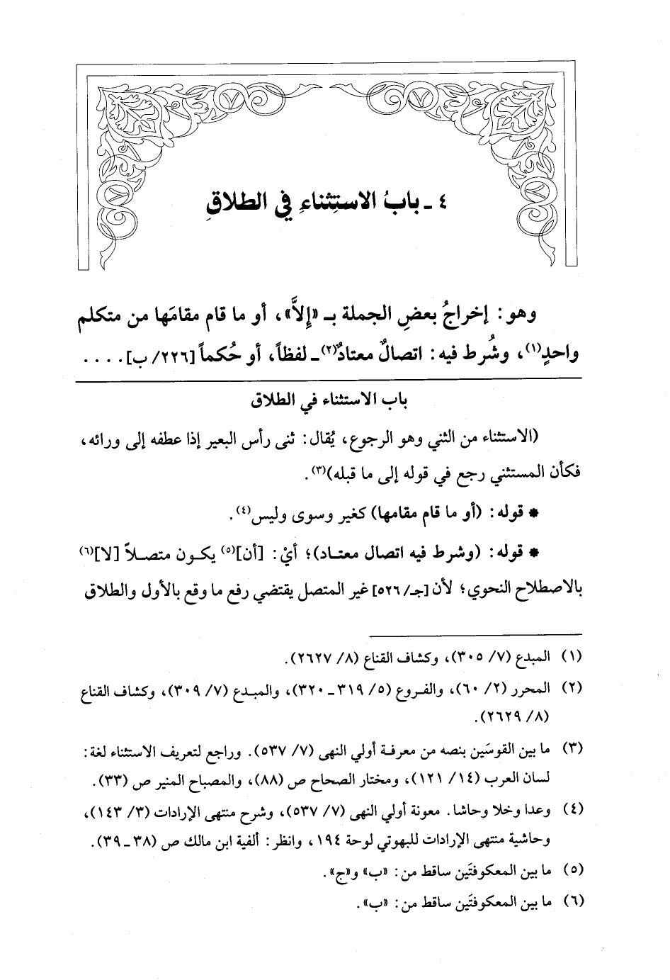 (¬3) ما بين القوسَين بنصه من معرفة أولي النهى (7/ 537). وراجع لتعريف الاستثناء لغة: لسان العرب (14/ 121)، ومختار الصحاح ص (88)، والمصباح المنير ص (33).