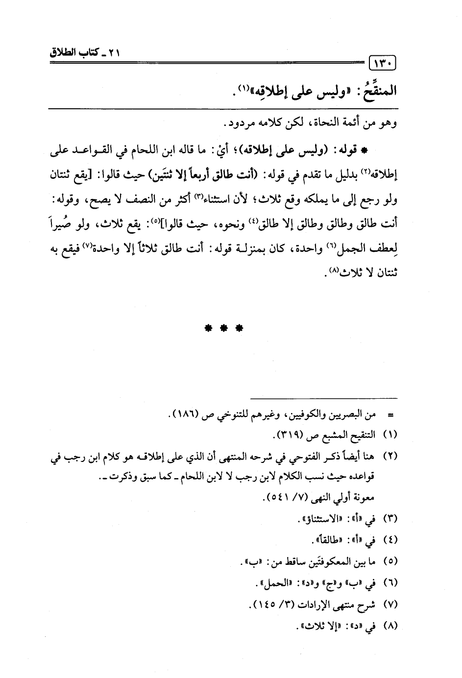 (¬2) هنا أيضًا ذكر الفتوحي في شرحه المنتهى أن الذي على إطلاقه هو كلام ابن رجب في قواعده حيث نسب الكلام لابن رجب لا لابن اللحام -كما سبق وذكرت-.