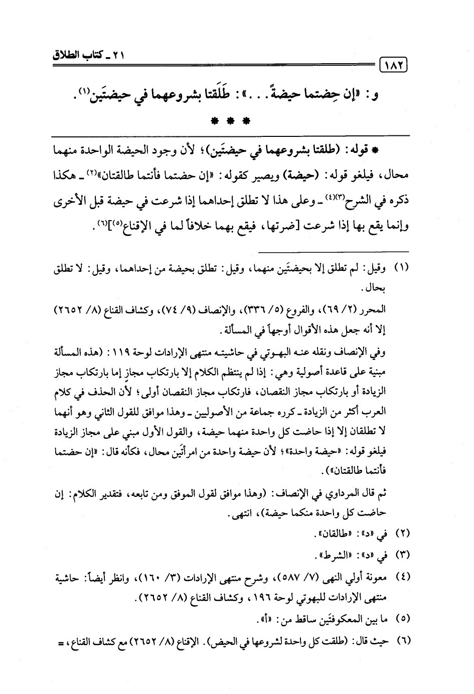(¬6) حيث قال: (طلقت كل واحدة لشروعها في الحيض). الإقناع (8/ 2652) مع كشاف القناع، =
