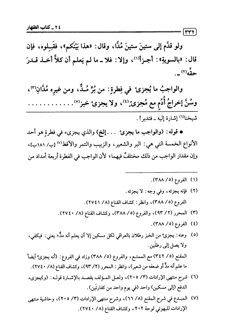 المقنع (5/ 342) مع الممتع، والفروع (5/ 388) وزاد في الفروع: (أنه يجزئ أيضًا ما علم أنه مدٌّ أو ضعفه من شعير)، وانظر: المحرر (2/ 93)، وكشاف القناع (8/ 2740).