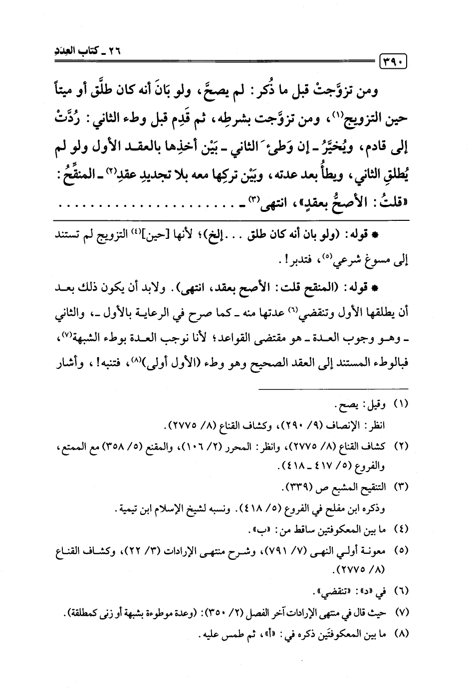 * قوله: (المنقح قلت: الأصح بعقد، انتهى). ولا بد أن يكون ذلك بعد أن يطلقها الأول وتنقضي (¬6) عدتها منه -كما صرح في الرعاية بالأول-، والثاني -وهو وجوب العدة- هو مقتضى القواعد؛ لأنا نوجب العدة بوطء الشبهة (¬7)، فبالوطء المستند إلى العقد الصحيح وهو وطء (الأول أولى) (¬8)، فتنبه!، وأشار