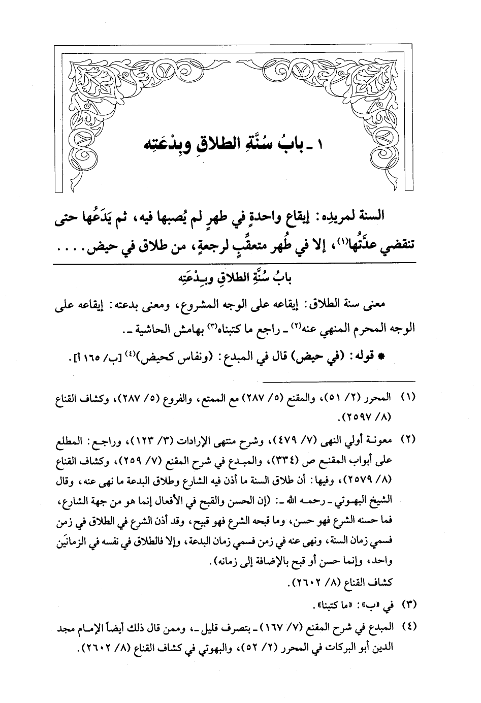 (¬2) معونة أولي النهي (7/ 479)، وشرح منتهى الإرادات (3/ 123)، وراجع: المطلع على أبواب المقنع ص (334)، والمبدع في شرح المقنع (7/ 259)، وكشاف القناع (8/ 2579)، وفيها: أن طلاق السنة ما أذن فيه الشارع وطلاق البدعة ما نهى عنه، وقال الشيخ البهوتي -رحمه اللَّه-: (إن الحسن والقبح في الأفعال إنما هو من جهة الشارع، فما حسنه الشرع فهو حسن، وما قبحه الشرع فهو قبيح، وقد أذن الشرع في الطلاق في زمن فسمي زمان السنة، ونهى عنه في زمن فسمي زمان البدعة، وإلا فالطلاق في نفسه في الزمانيَن واحد، وإنما حسن أو قبح بالإضافة إلى زمانه).