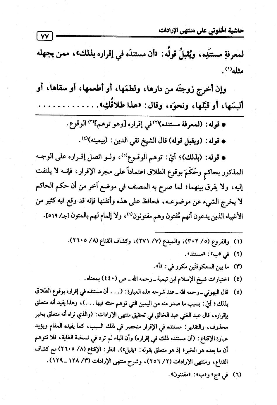 (¬5) قال البهوتي -رحمه اللَّه- عند شرحه هذه العبارة: (. . . أن مستنده في إقراره بوقوع الطلاق بذلك؛ أيْ: بسبب ما صدر منه من اليمين التي توهم حنثه فيها. . .)، وهذا يفيد أنه متعلق بإقراره، قال عبد الغني عبد الخالق في تحقيق منتهى الإرادات: (والذي نراه أنه متعلق بخبر محذوف، والتقدير: مستنده في الإقرار منحصر في ذلك السبب، كما يفيده المقام ويؤيد عبارة الإقناع: (أن مستنده ذلك في إقراره) وأن الباء لم ترد في نسخة الغاية، فلا تتوهم أن ما بعده هو الخبر؛ إذ هو متعلق بقوله: "يقبل"). انظر: الإقناع (8/ 2605) مع كشاف القناع، ومنتهى الإرادات (2/ 256)، وشرح منتهى الإرادات (3/ 128 - 129).