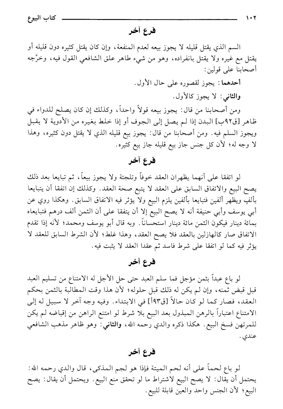 ومن أصحابنا من قال: يجوز بيعه قولًا واحدًا، وكذلك إن كان يصلح للدواء في ظاهر [ق 92 ب] البدن إذا لم يصل إلى الجوف أو إذا خلط بغيره من الأدوية لا يقبل ويجوز السلم فيه. ومن أصحابنا من قال: يجوز بيع قليله الذي لا يقتل دون كثيره، وهذا لا وجه له؛ لأن كل جنس جاز بيع قليله جاز بيع كثيره.