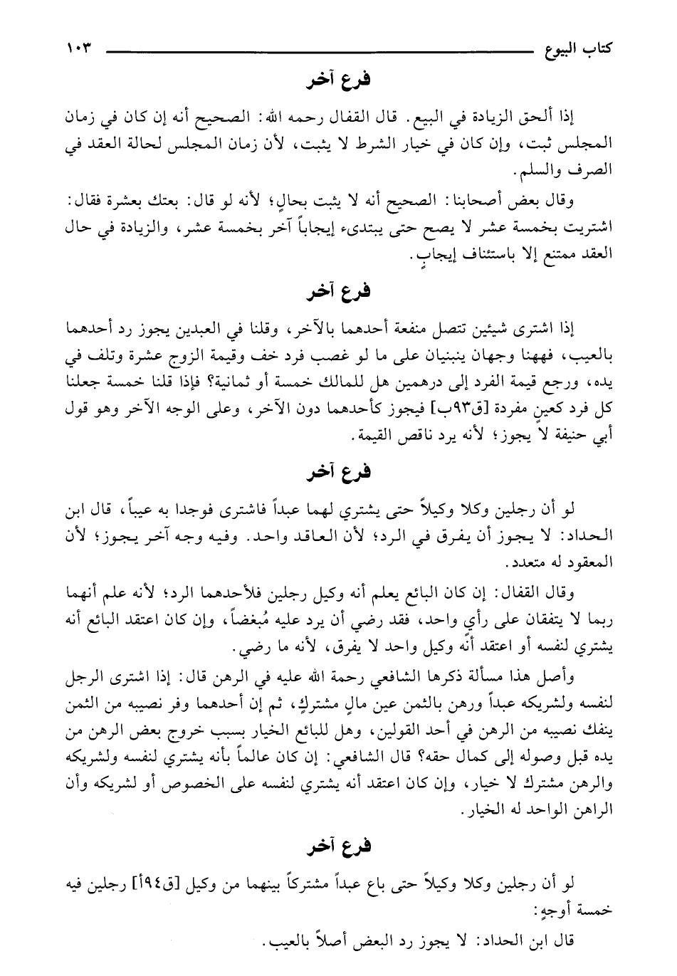 وقال القفال: إن كان البائع يحلم أن وكيل رجلين فلأحدهما الرد؛ لأنه علم أنهما ربنا لا يتفقان على رأيٍ واحد، فقد رضي أن يرد عليه مُبغضًا، وإن كان اعتقد البائع أنه يشتري لنفسه أو اعتقد أنه وكيل واحد لا يفرق، لأنه ما رضي.