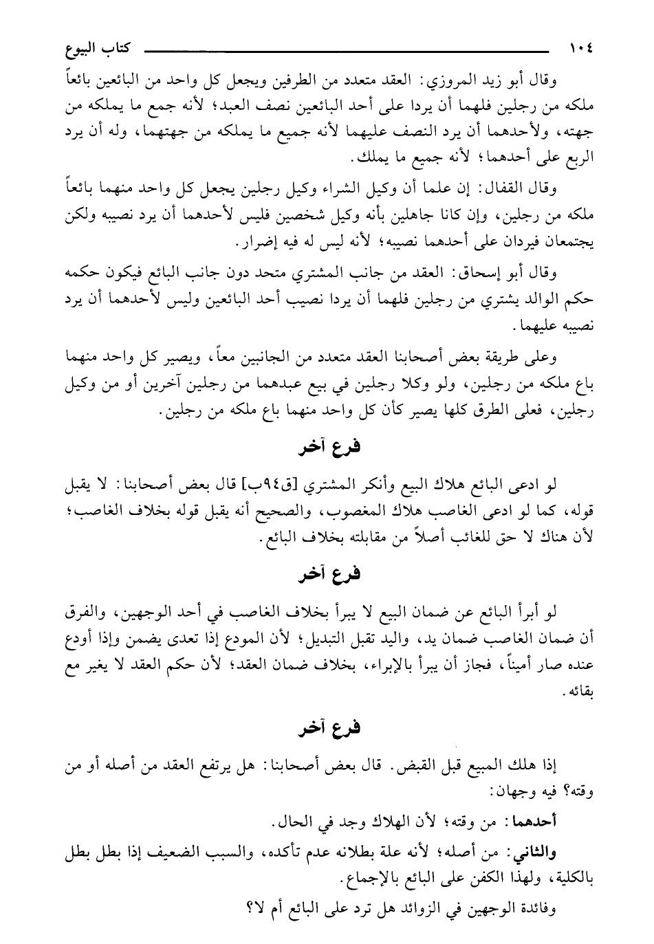 وقال أبو زيد المروزي: العقد متعدد من الطرفين ويجعل كل واحد من البائعين بائعًا ملكه من رجلين فلهما أن يردا على أحد البائعين نصف العبد؛ لأنه جمع ما يملكه من جهته، ولأحدهما أن يرد النصف عليهما لأنه جميع ما يملكه من جهتهما، وله أن يرد الربع على أحدهما؛ لأنه جميع ما يملك.