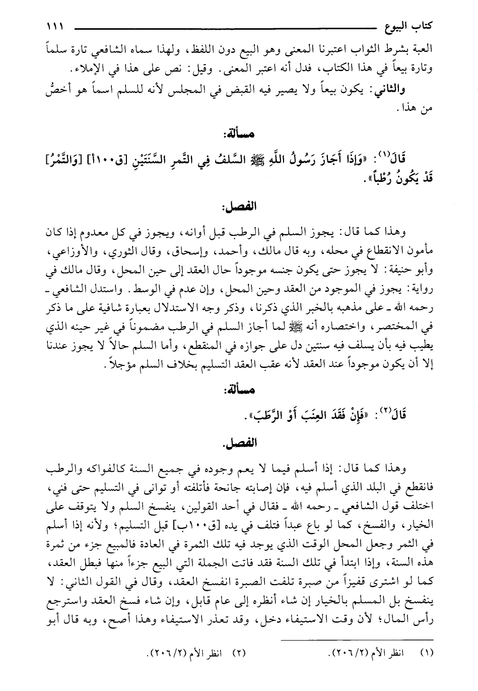 قَالَ: "وَإذَا أَجَازَ رَسُولُ اللَّهِ صلى الله عليه وسلم السّلفُ فِي التَّمرِ السَّنَتَيْنِ [ق 100 أ] [وَالتَّمْرُ] قَدْ يَكُونُ رُطْباً".