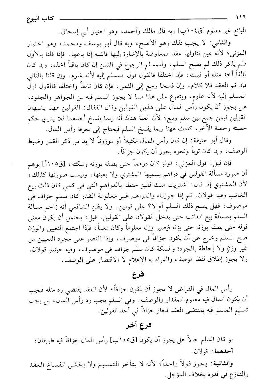 والثاني: لا يجب ذلك وهو الأصح، وبه قال أبو يوسف ومحمد، وهو اختيرا المزني؛ لأنه عين تناولها عقد المعاوضة بالإشارة إليها فأشبه إذا باعها. فإذا قلنا بالأول فلم يذكر ذلك لم يصح السلم، وللمسلم الرجوع في الثمن إن كان باقيًا أخذه، وإن كان تالفًا أخذ مثله أو قيمته، فإن اختلفا فالقول قول المسلم إليه لأنه غارم. وإن قلنا بالثاني فإن تم العقد فلا كلام، وإن فسخا رجع إلى الثمن، فإن كان تالفًا واختلفا فالقول قول المسلم إليه لأنه غارم. ويتفرع على هذا مما لا يجوز السلم فيه من الجواهر والجلود، هل يجوز أن يكون رأس المال على هذين القولين وقال القفال: القولين ههنا يشبهان القولين فيمن جمع بين سلم وبيع؛ لأن العلة هناك أنه ربما يفسخ أحدهما فلا يدري حكم حصته وحصة الآخر، كذلك ههنا ربما يفسخ السلم فيحتاج إلى معرفة رأس المال.