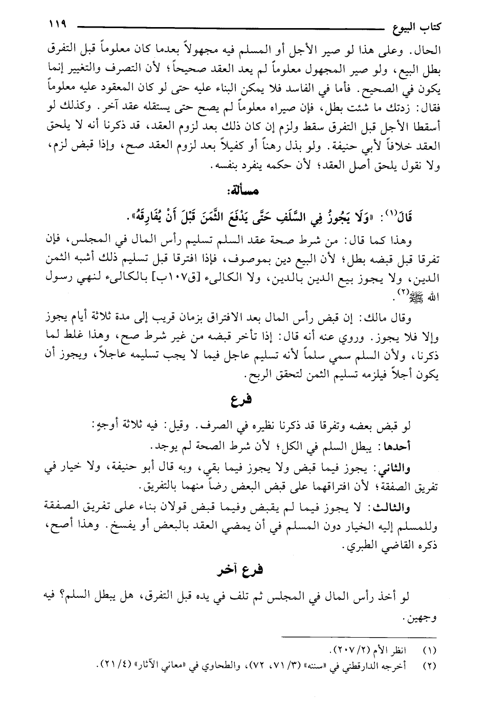 وقال مالك: إن قبض رأس المال بعد الافتراق بزمان قريب إلى مدة ثلاثة أيام يجوز وإلا فلا يجوز. وروي عنه أنه قال: إذا تأخر قبضه من غير شرط صح، وهذا غلط لما ذكرنا، ولأن السلم سمي سلمًا لأنه تسليم عاجل فيما لا يجب تسليمه عاجلًا، ويجوز أن يكون أجلًا فيلزمه تسليم الثمن لتحقق الربح.