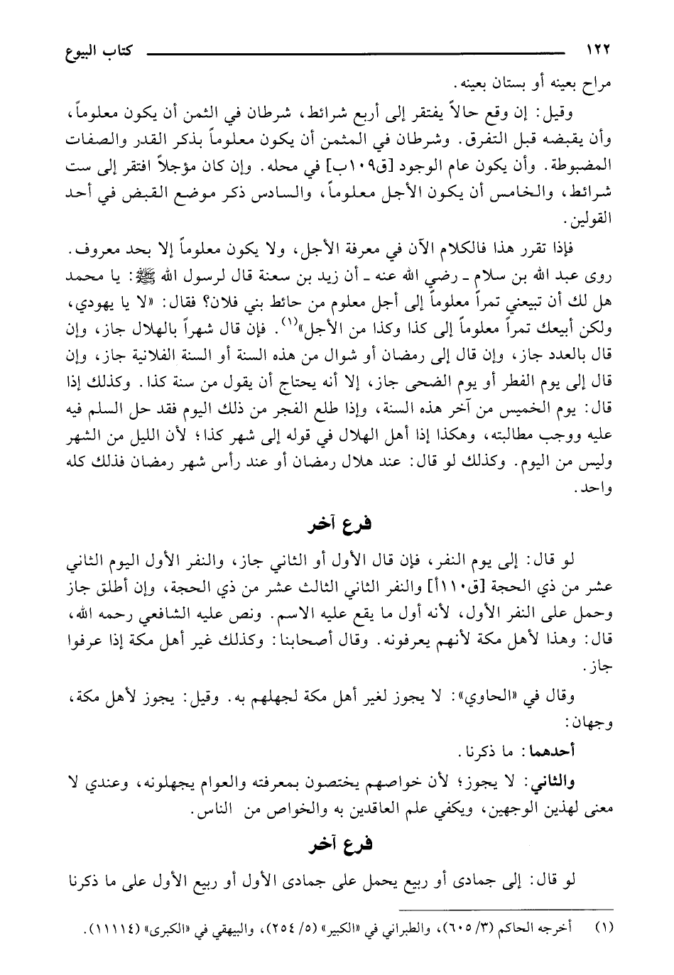 فإذا تقرر هذا فالكلام الآن في معرفة الأجل, ولا يكون معلومًا إلا بحد معروف. روى عبد الله بن سلام- رضي الله عنه- أن زيد بن سعنة قال لرسول الله صلى الله عليه وسلم: يا محمد هل لك أن تبيعني تمرًا معلومًا إلى أجل معلوم من حائط بني فلان؟ فقال: ((لا يا يهودي, ولكن أبيعك تمرًا معلومًا إلى كذا وكذا من الأجل)). فإن قال شهرًا بالهلال جاز, وإن قال بالعدد جاز, وإن قال إلى رمضان أو شوال من هذه السنة أو السنة الفلانية جاز, وإن قال إلى يوم الفطر أو يوم الضحى جاز, إلا أنه يحتاج أن يقول من سنة كذا. وكذلك إذا قال: يوم الخميس من آخر هذه السنة, وإذا طلع الفجر من ذلك اليوم فقد حل السلم فيه عليه ووجب مطالبته, وهكذا إذا أهل الهلال في قوله إلى شهر كذا؛ لأن الليل من الشهر وليس من اليوم. وكذلك لو قال: عند هلال رمضان أو عند رأس شهر رمضان فذلك كله واحد.