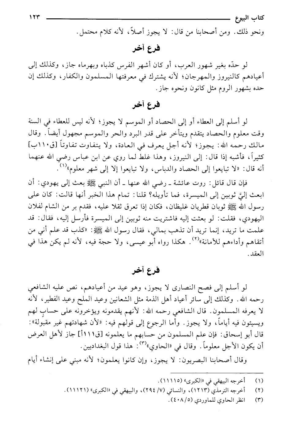 لو أسلم إلى فصح النصارى لا يجوز, وهو عيد من أعيادهم, نص عليه الشافعي رحمه الله. وكذلك إلى سائر أعياد أهل الذمة مثل الشعانين وعيد الملح وعيد الملح وعيد الفطير, لأنه لا يعرفه المسلمون. قال الشافعي رحمه الله: لأنهم يقدمونه ويؤخرونه على حساب لهم ويسيئون فيه أيامًا, ولا يجوز. وأما الرجوع إلى قولهم فيه: ((لأن شهادتهم غير مقبولة)): قال أبو إسحاق: فإن علم المسلمون من حسابهم ما يعلمونه [ق 111 أ] جاز لأهل العرض أن يكون الأجل معلومًا. وقال في ((الحاوي)): هذا قول البغداديين.