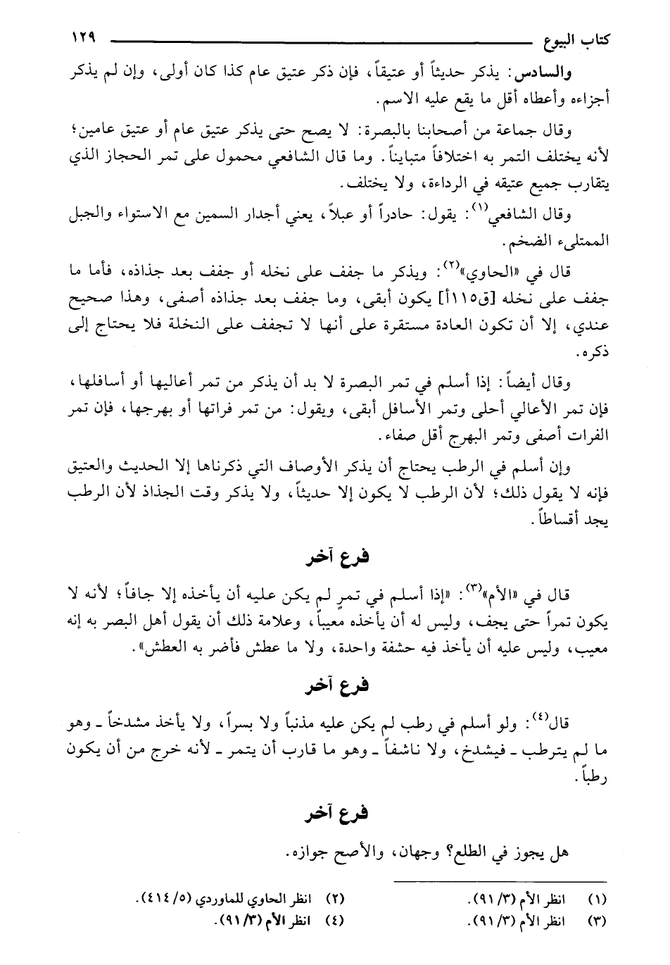 وقال أيضًا: إذا أسلم في تمر البصرة لابد أن يذكر من تمر أعاليها أو أسافلها, فإن تمر الأعالي أحلى وتمر الأسافل أبقى, ويقول: من تمر فراتها أو بهرجها, فإن تمر الفرات أصفي وتمر البهرج أقل صفاء.
