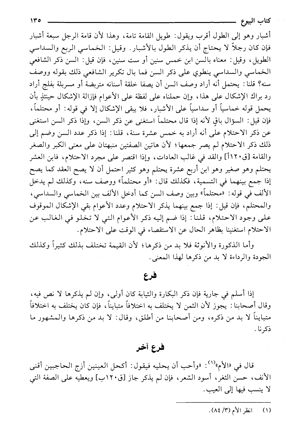 أشبار وهو إلى الطول أقرب ويقول: طويل القامة تامة, وهذا لأن قامة الرجل سبعة أشبار فإن كان رجلاً لا يحتاج أن يذكر الطول بالأشبار. وقيل: الخماسي الربع والسداسي الطويل, وقيل: معناه بالسن ابن خمس سنين أو ست سنين, فإن قيل: السن ذكر الشافعي الخماسي والسداسي ينطوي على ذكر السن فما بال تكرير الشافعي ذلك بقوله ووصف سنة؟ قلنا: يحتمل أنه أراد وصف السن أن يصفا خلقه أسنانه متربضة أو مسربلة بفلج أراد رد براك الإشكال على هذا, وإن حملناه على لفظة على العوام فإزالة الإشكال حينئذٍ بأن يحمل قوله خماسيًا أو سداسيًا على الأشبار, فلا يبقى الإشكال إلا في قوله: أو محتلمًا, فإن قيل: السؤال باقٍ لأنه إذا قال محتلمًا استغنى عن ذكر السن, وإذا ذكر السن استغنى عن ذكر الاحتلام على أنه أراد به خمس عشرة سنة, قلنا: إذا ذكر عدد السن وضم على ذلك ذكر الاحتلام لم يصر جمعها؛ لأن هاتين الصفتين منبهتان على معنى الكبر والصغر والقامة [ق 120 أ] والقد في غالب العادات, وإذا اقتصر على مجرد الاحتلام, فابن العشر يحتلم وهو صغير وهو ابن أربع عشرة يحتلم وهو كثير احتمل أن لا يصح العقد كما يصح إذا جمع بينهما في التسمية, فكذلك قال: ((أو محتلمًا)) ووصف سنة, وكذلك لم يدخل الألف في قوله: ((محتلمًا)) وبين وصف السن كما أدخل اللف بين الخماسي والسداسي, والمحتلم, فإن قيل: إذا جمع بينهما يذكر الاحتلام وعدد الأعوام بقي الإشكال الموقوف على وجود الاحتلام, قلنا: إذا ضم إليه ذكر الأعوام التي لا تخلو في الغالب عن الاحتلام استغنينا بظاهر الحال عن الاستقصاء في الوقت على الاحتلام.