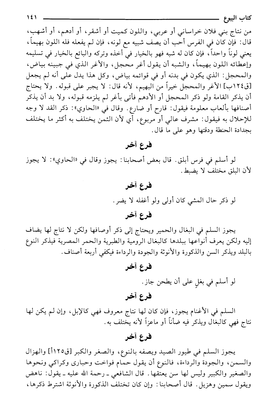 من نتاج بني فلان خراساني أو عربي، واللون كميت أو أشقر، أو أدهم، أو أشهب، قال: فإن كان في الفرس أحب أن يصف شبيه مع لونه، فإن لم يفعله فله اللون بهيمًا، يعني لونًا واحدًا، فإن كان له شبه فهو بالخيار في أخذه وتركه والبائع بالخيار في تسليمه وإعطائه اللون بهيمًا، والشبه أن يقول أغر محجل، والأغر الذي في جبينه بياض، والمحجل: الذي يكون في بدنه أو في قوائمه بياض، وكل هذا يدل على أنه لم يجعل [ق 124 ب] الأغر والمحجل خيرًا من البهيم، لأنه قال: لا يجبر على قبوله. ولا يحتاج أن يذكر القامة ولو ذكر المحجل أو الأدهم فأتى بأغر لم يلزمه قبوله، ولا بد أن يذكر أصنافها بألعاب معلومة فيقول: قارح أو ضارع. وقال في ((الحاوي)): ذكر القد لا وجه للإحلال به فيقول: مشرف عافي أو مربوع، أي لأن الثمن يختلف به أكثر ما يختلف بجدادة الحنطة ودقتها وهو على ما قال.