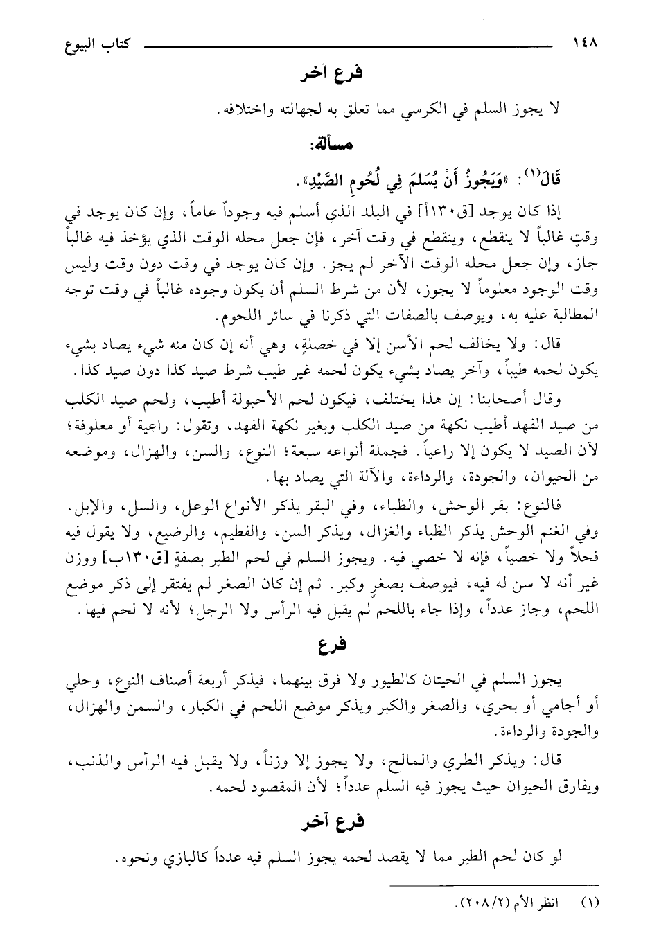 وفي الغنم الوحش يذكر الظباء والغزال، ويذكر السن، والفطيم، والرضيع، ولا يقول فيه فحلًا ولا خصيًا، فإنه لا خصي فيه. ويجوز السلم في لحم الطير بصفة [ق 130 ب] ووزن غير أنه لا سن له فيه، فيوصف بصغر وكبر. ثم إن كان الصغر لم يفتقر إلى ذكر موضع اللحم، وجاز عددًا، وإذا جاء باللحم لم يقبل فيه الرأس ولا الرجل؛ لأنه لا لحم فيها.