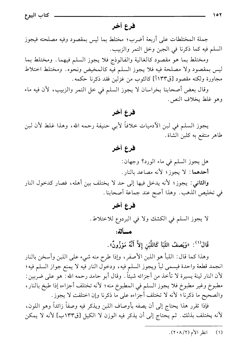 ومختلط بما هو مقصود كالغالية والفالوذج فلا يجوز السلم فيهما. ومختلط بما ليس بمقصود ولا مصلحة فيه فلا يجوز السلم فيه كالمخيض ونحوه. ومختلط اختلاط مجاورة ولكنه مقصود [ق 133 أ] كالثوب من غزلين فقد ذكرنا حكمه.
