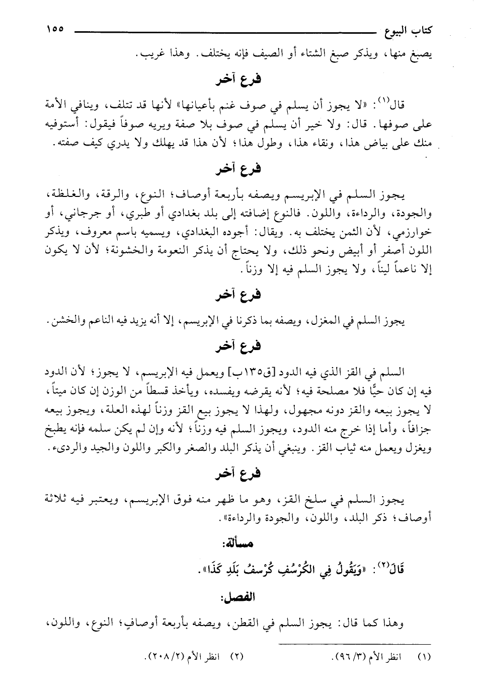 يجوز السلم في الإبريسم ويصفه بأربعة أوصاف؛ النوع، والرقة، والغلظة، والجودة، والرداءة، واللون. فالنوع إضافته إلى بلد بغدادي أو طبري، أو جرجاني، أو خوارزمي، لأن الثمن يختلف به. ويقال: أجوده البغدادي، ويسميه باسم معروف، ويذكر اللون أصفر أو أبيض ونحو ذلك، ولا يحتاج أن يذكر النعومة والخشونة؛ لأن لا يكون إلا ناعماً ليناً، ولا يجوز السلم فيه إلا وزناً.