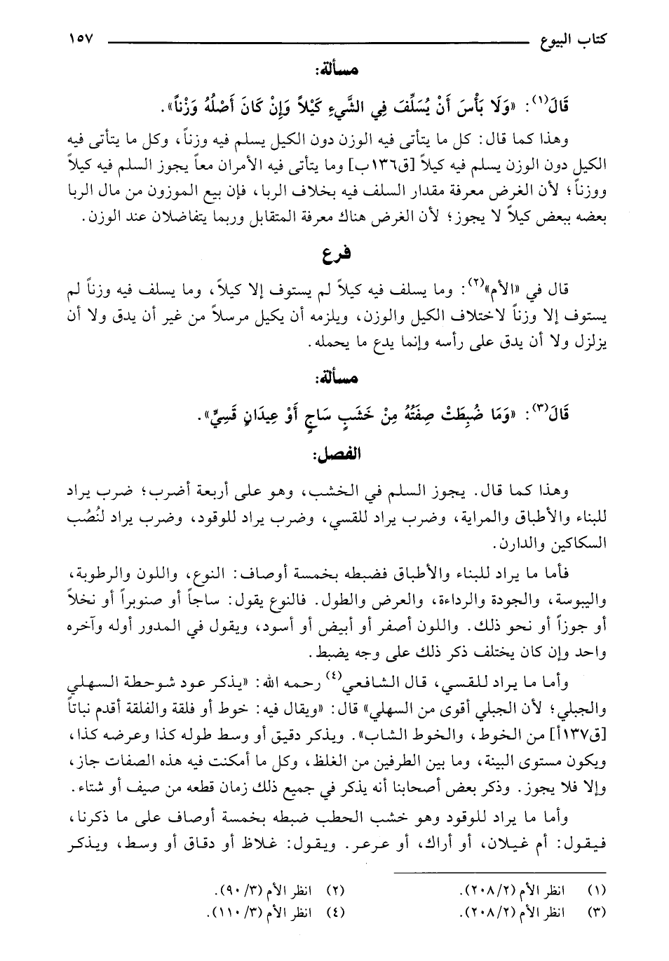وأما ما يراد للقسي، قال الشافعي رحمه الله: «يذكر عود شوحطة السهلي والجبلي؛ لأن الجبلي أقوى من السهلي» قال: «ويقال فيه: خوط أو فلقة والفلقة أقدم نباتاً [ق 137 أ] من الخوط، والخوط الشاب». ويذكر دقيق أو وسط طوله كذا وعرضه كذا، ويكون مستوى البينة، وما بين الطرفين من الغلظ، وكل ما أمكنت فيه هذه الصفات جاز، وإلا فلا يجوز. وذكر بعض أصحابنا أنه يذكر في جميع ذلك زمان قطعه من صيف أو شتاء.