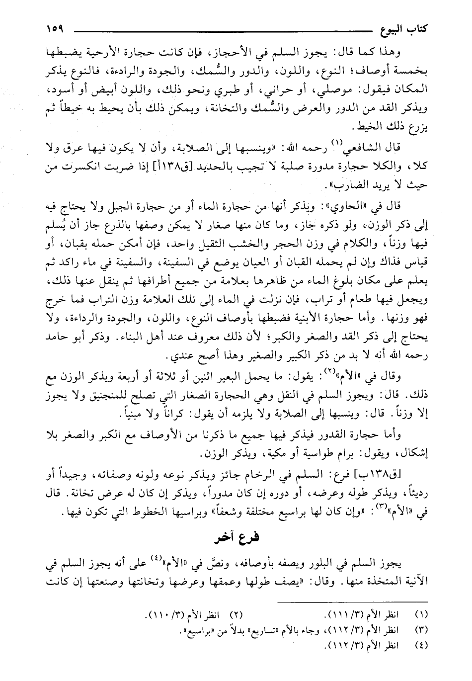 [ق 138 ب] فرع: السلم في الرخام جائز ويذكر نوعه ولونه وصفاته، وجيداً أو رديئاً، ويذكر طوله وعرضه، أو دوره إن كان مدوراً، ويذكر إن كان له عرض تخانة. قال في «الأم»: «وإن كان لها براسيع مختلفة وشعفاً» وبراسيها الخطوط التي تكون فيها.