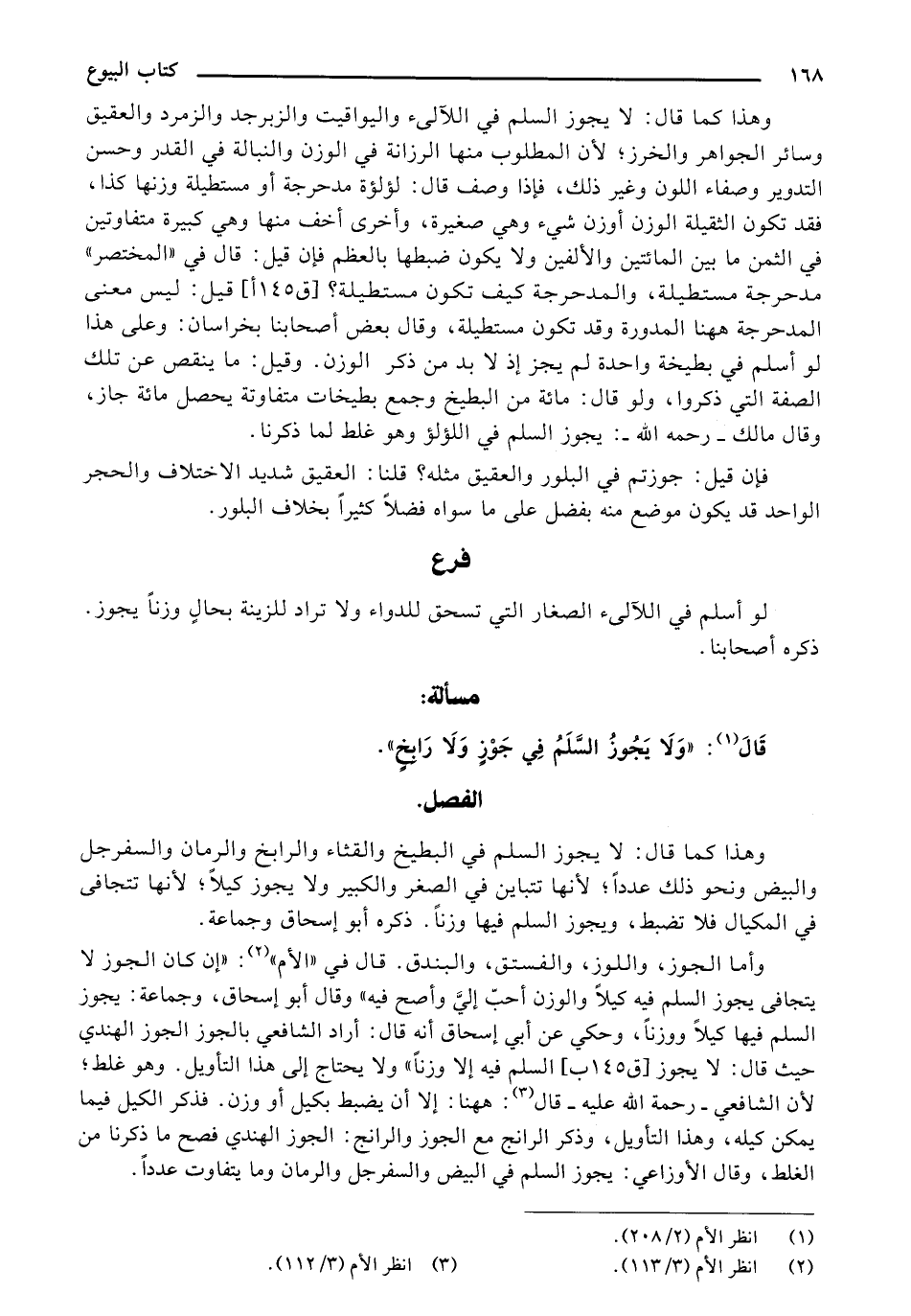 وأما الجوز، واللوز، والفستق، والبندق. قال في "الأم": "إن كان الجوز لا يتجافي يجوز السلم فيه كيلاً والوزن أحب إلى وأصح فيه" وقال أبو إسحاق، وجماعة: يجوز السلم فيها كيلاً ووزناً، وحكي عن أبي إسحاق أنه قال: أراد الشافعي بالجوز الجوز الهندي حيث قال: لا يجوز [ق 145 ب] السلم فيه إلا وزناً" ولا يحتاج إلى هذا التأويل. وهو غلط، لأن الشافعي - رحمة الله عليه - قال: ههنا: إلا أن يضبط بكيل أو وزن. فذكر الكيل فيما يمكن كيله، وهذا التأويل، وذكر الرانج مع الجوز والرانج: الجوز الهندي فصح ما ذكرنا من الغلط، وقال الأوزاعي: يجوز السلم في البيض والسفرجل والرمان وما يتفاوت عدداً.
