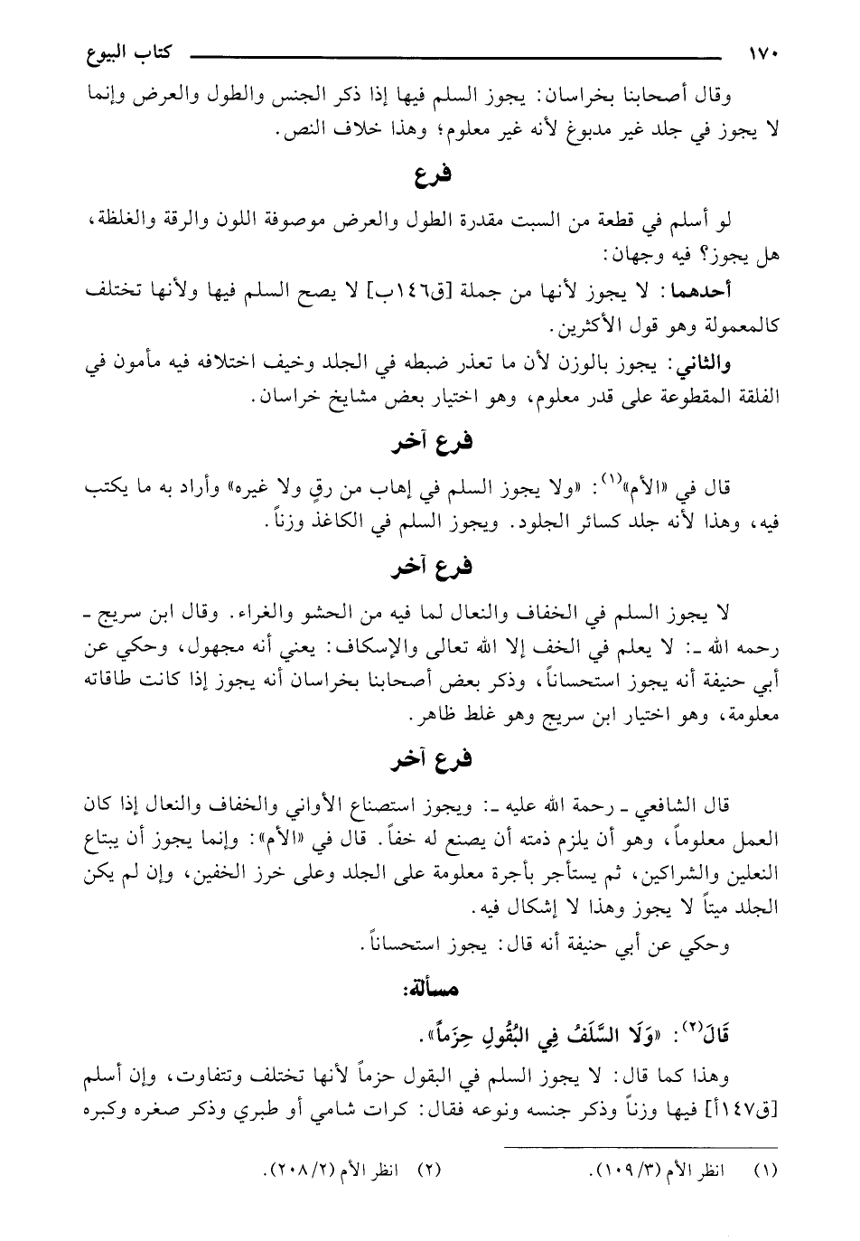 لا يجوز السلم في الخفاف والنعال لما فيه من الحشو والغراء. وقال ابن سريج - رحمه الله -: لا يعلم في الخف إلا الله تعالى والإسكاف: يعني أنه مجهول، وحكي عن أبي حنيفة أنه يجوز أن يبتاع النعلين والشراكين، ثم يستأجر بأجرة معلومة على الجلد وعلى خرز الخفين، وإن لم يكن الجلد ميتاً لا يجوز وهذا لا إشكال فيه.
