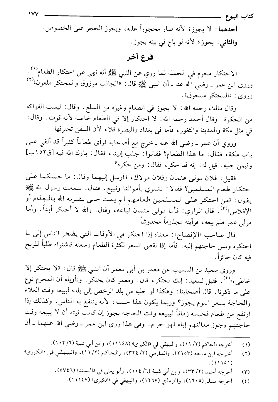 فقيل: فلان مولى عثمان وفلان مولاك، فأرسل إليهما وقال: ما حملكما على احتكار طعام المسلمين؟ فقالا: نشتري بأموالنا ونبيع. فقال: سمعت رسول الله صلى الله عليه وسلم يقول: "من احتكر على المسلمين طعامهم لم يمت حتى يضربه الله بالجذام أو الإفلاس". وقال الراوي: فأما مولى عثمان فباعه، وقال: والله لا احتكر أبداً. وأما مولى عمر فلم يبعه، فرأيته مجذوماً مخدوشاً.