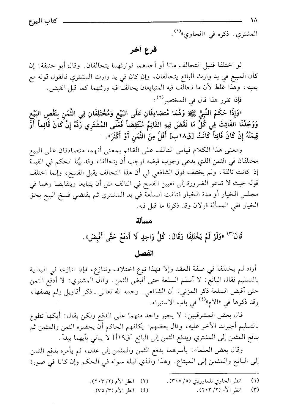 "وَإِِذَا حَكَمَ النًّبِيُّ صلى الله عليه وسلم وهُمَا مُتصَادِقَانِ عَلَى البَيْعِ وَمُخْتَلِفَانِ فِي الثَّمَنِ بنَقْصِ البَيْعِ وَوَجَدْنَا الفَائِتَ فِي كُلِّ مَا نَقَضَ فِيهِ القَائِمُ مُنْتَقِضًا فَعَلَى المُشْترِي رَدُهُ إِنْ كَانَ قَائِمًا أَوْ قِيمَتُهُ إِنْ كَانَ فَائِتًا كَانَتْ [ق 18 ب] أَقَلَّ مِنَ الثَّمَنِ أَوْ أَكْثَرَ".