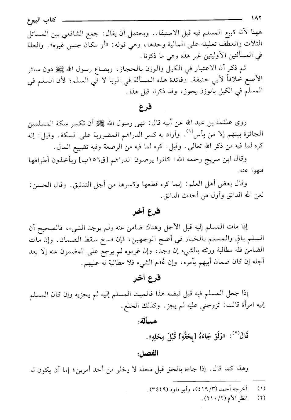 ثم ذكر أن الاعتبار في الكيل والوزن بالحجاز، وبصاع رسول الله صلى الله عليه وسلم دون سائر الأصع خلافاً لأبي حنيفة. وفائدة هذه المسألة في الربا لا في السلم، لأن السلم في المسلم في الكيل بالوزن يجوز، وقد ذكرنا قبل هذا.