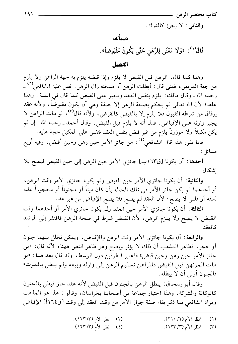قال: "وَلاَ مَعْنَىِ للرَّهْنِ حَتَّى يَكُونَ مَقْبُوضًا ".