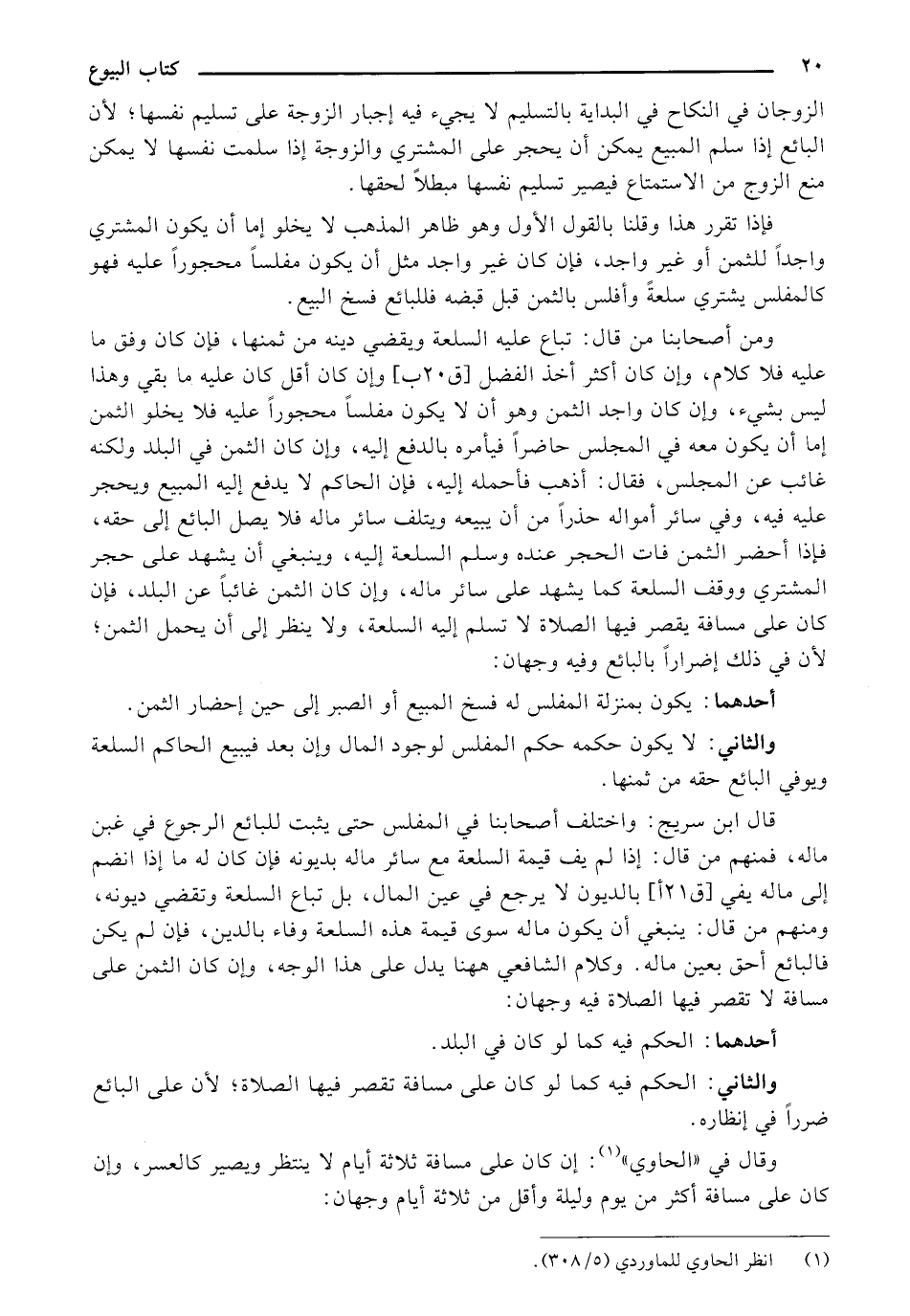 قال ابن سريج: واختلف أصحابنا في المفلس حتى يثبت للبائع الرجوع في غبن ماله، فمنهم من قال: إذا لم يف قيمة السلعة مع سائر ماله بديونه فإن كان له ما إذا انضم إلى ماله يفي [ق 21 أ] بالديون لا يرجع في عين المال، بل تباع السلعة وتقضي ديونه، ومنهم من قال: ينبغي أن يكون ماله سوى قيمة هذه السلعة وفاء بالدين، فإن لم يكن فالبائع أحق بعين ماله. وكلام الشافعي ههنا يدل على هذا الوجه، وإن كان الثمن على مسافة لا تقصر فيها الصلاة فيه وجهان: