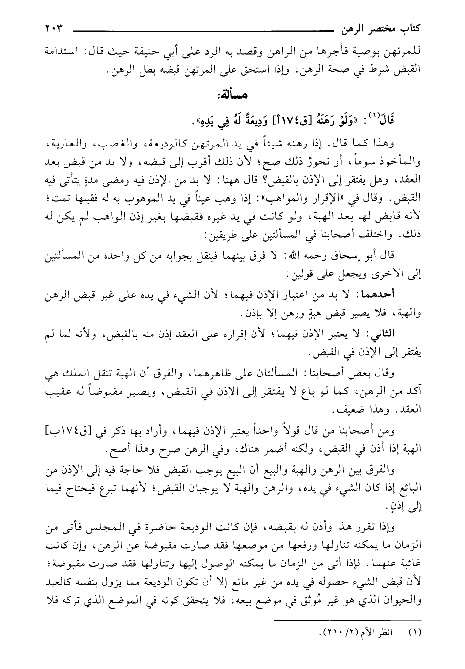 للمرتهن بوصية فأجرها من الراهن وقصد به الرد على أبي حنيفة حيث قال: استدامة القبض شرط في صحة الرهن، وإذا استحق على المرتهن قبضه بطل الرهن.