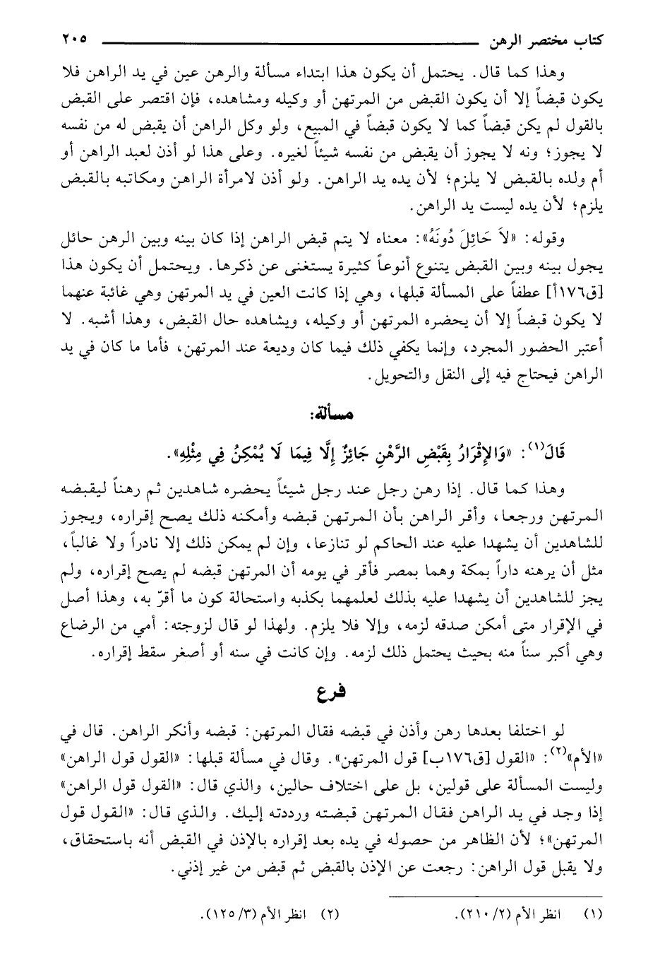 قَالَ: "وَالإِقْرَارُ بِقَبْضِ الرَّهْنِ جَائِزٌ إِلاَّ فِيمَا لاَ يُمْكِنُ فِي مِثْلِه ".