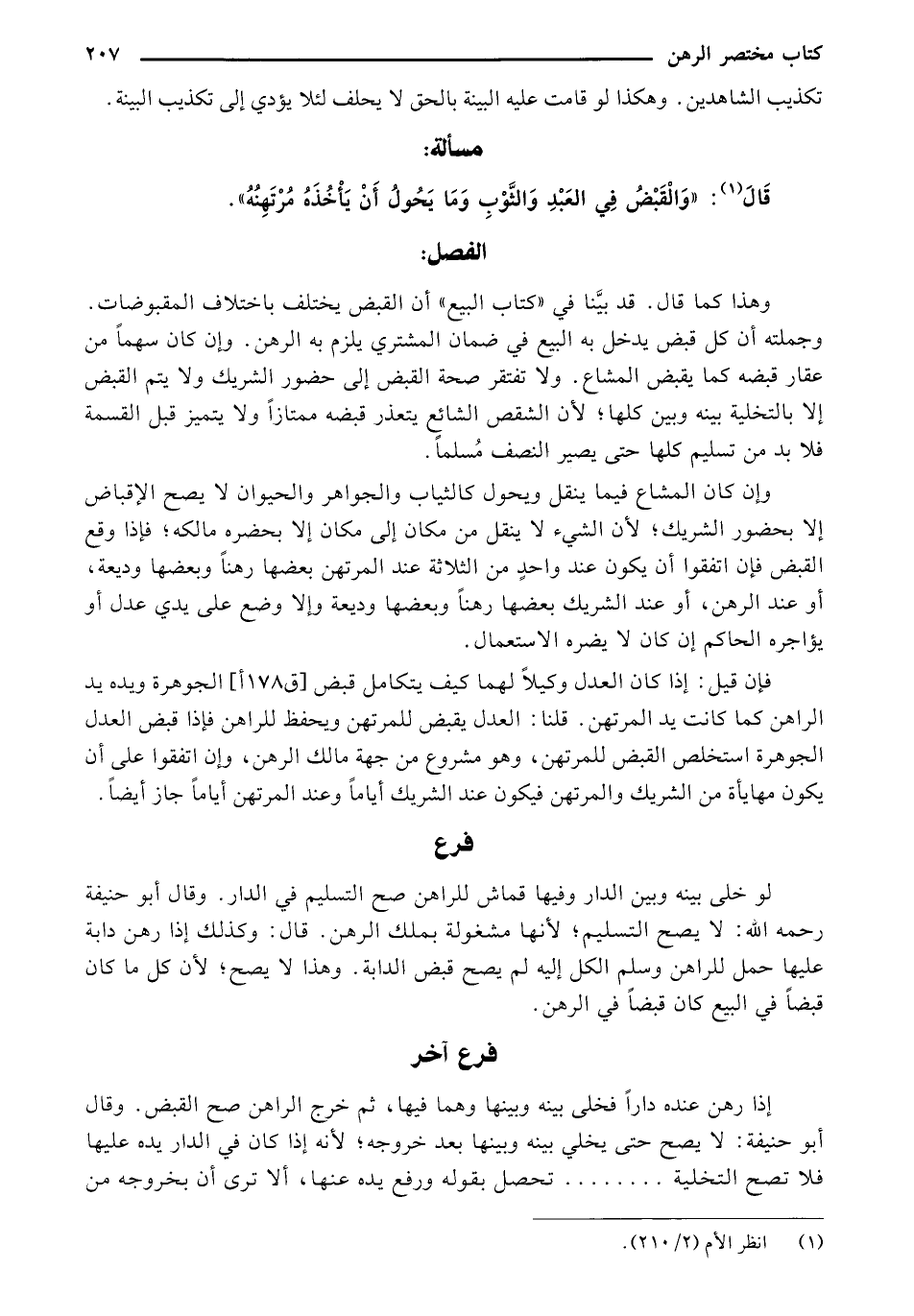 قَالَ: "وَالقَبْضُ فِي العَبْدِ وَالثَّوْبِ وَمَا يَحُولُ أَنْ يَأُخُذَهُ مُرْتَهِنُهُ ".