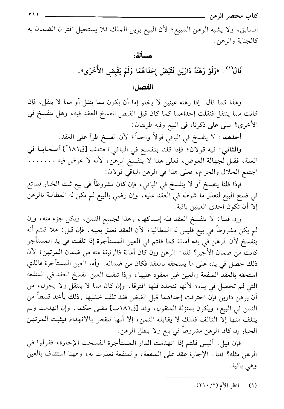 وإن قلنا: لا ينفسخ العقد فله إمساكها، وهذا لجميع الثمن، وبكل جزء منه، وإن لم يكن مشروطًا في بيع فليس له المطالبة؛ لأن العقد تعلق بعينه. فإن قيل: هلا قلتم أنه ينفسخ لأن الرهن في يده أمانة كما قلتم في العين المستأجرة إذا تلفت في يد المستأجر كانت من ضمان الأجير؟ قلنا: الرهن وإن كان أمانة فالوثيقة منه من ضمان المرتهن؛ لأن ذلك حصل في يده على ما يستحقه بالعقد فكان من ضمانه. وأما العين المستأجرة فالذي استحقه بالعقد المنفعة والعين غير معقود عليها، وإذا تلفت العين انفسخ العقد في المنفعة التي لم تحصل في يده؛ لأنها تتحدد فلها افترقا. وإن كان مما لا ينتقل ولا يحول، من أن يرهن داريين فإن احترقت إحداهما قبل القبض فقد تلف خشبها وذلك يأخذ قسطًا من الثمن في البيع، ويكون بمنزلة المنقول، وقد [ق 181 ب] مضى حكمه. وإن انهدمت ولم يتلف منها إلا التالف فذلك لا يقابله الثمن، إلا أنها تنقض بالانهدام فيثبت المرتهن الخيار إن كان الرهن مشروطًا في بيع ولا يبطل الرهن.