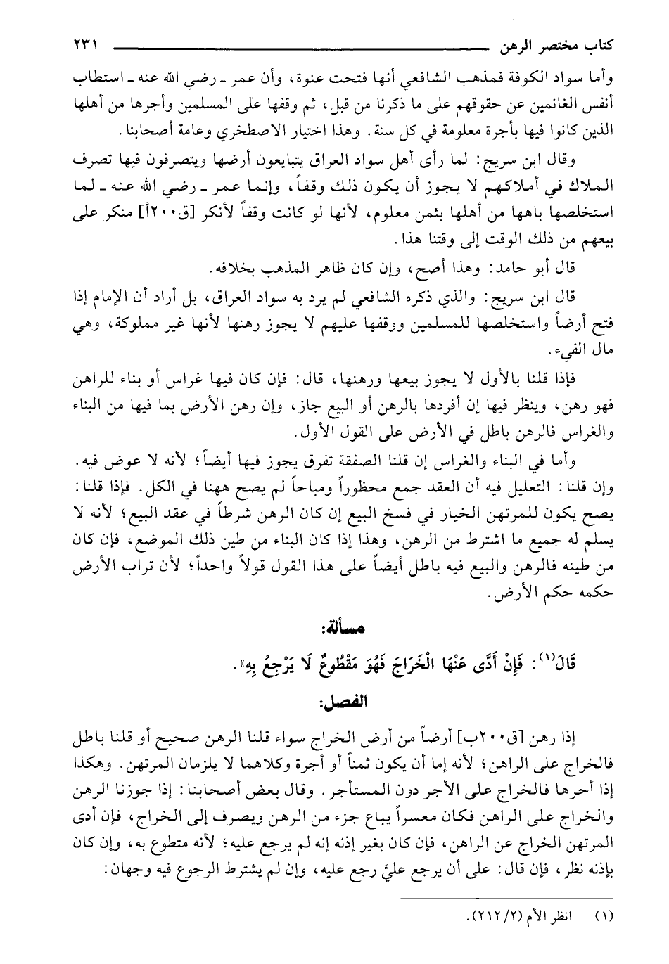 قال ابن سريج: والذي ذكره الشافعي لم يرد به سواد العراق, بل أراد أن الإمام إذا فتح أرضاً واستخلصها للمسلمين ووقفها عليهم لا يجوز رهنها لأنها غير مملوكة, وهي مال الفيء.